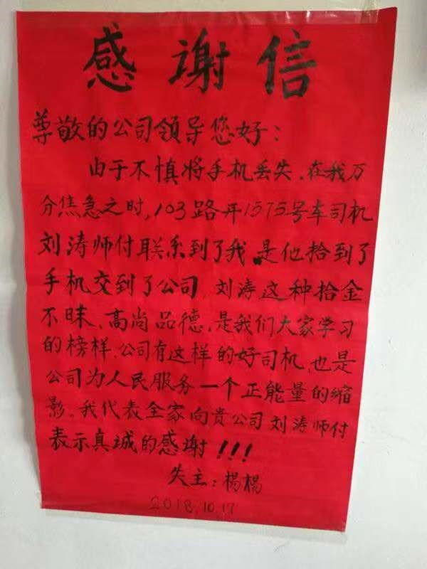 2.10月17日,103路駕駛員劉濤拾到一部OPPO手機(jī),細(xì)心的他按照電話里的信息聯(lián)系到了失主,由于失主在公交車上丟了手機(jī),真沒(méi)報(bào)任何希望,司機(jī)拾到手機(jī)并主動(dòng)聯(lián)系失主這一行為,深深的打動(dòng)了這位叫楊楊的女士,于是她親手寫(xiě)了一封表?yè)P(yáng)信交到路隊(duì),她說(shuō):劉濤師傅的高尚品德,正是公交人為乘客服務(wù)正能量的一個(gè)縮影。