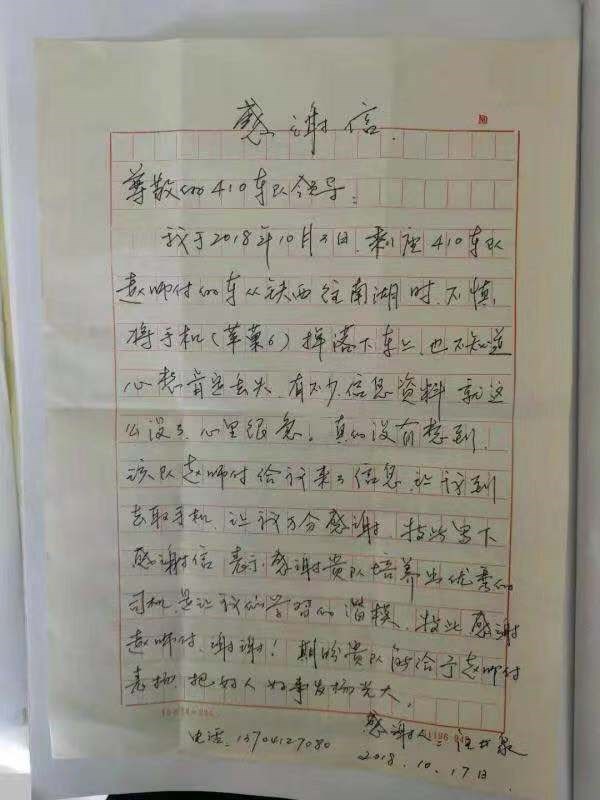 5.2018年10月16日,汪先生乘坐410線2061號(hào)駕駛員趙正博師傅車從鐵西往南湖走時(shí),不慎將手機(jī)掉到了車?yán),下車后,汪先生很是著急,因(yàn)槭謾C(jī)內(nèi)有不少信息,正在焦急中,趙師傅拾到他的手機(jī)給他的家人去了信息,并把手機(jī)交到410線調(diào)度室,汪先生帶著表?yè)P(yáng)信來(lái)到調(diào)度室,調(diào)度及時(shí)把手機(jī)還給了失主,汪先生連連感謝,感謝貴公司培養(yǎng)出這樣優(yōu)秀的駕駛員。