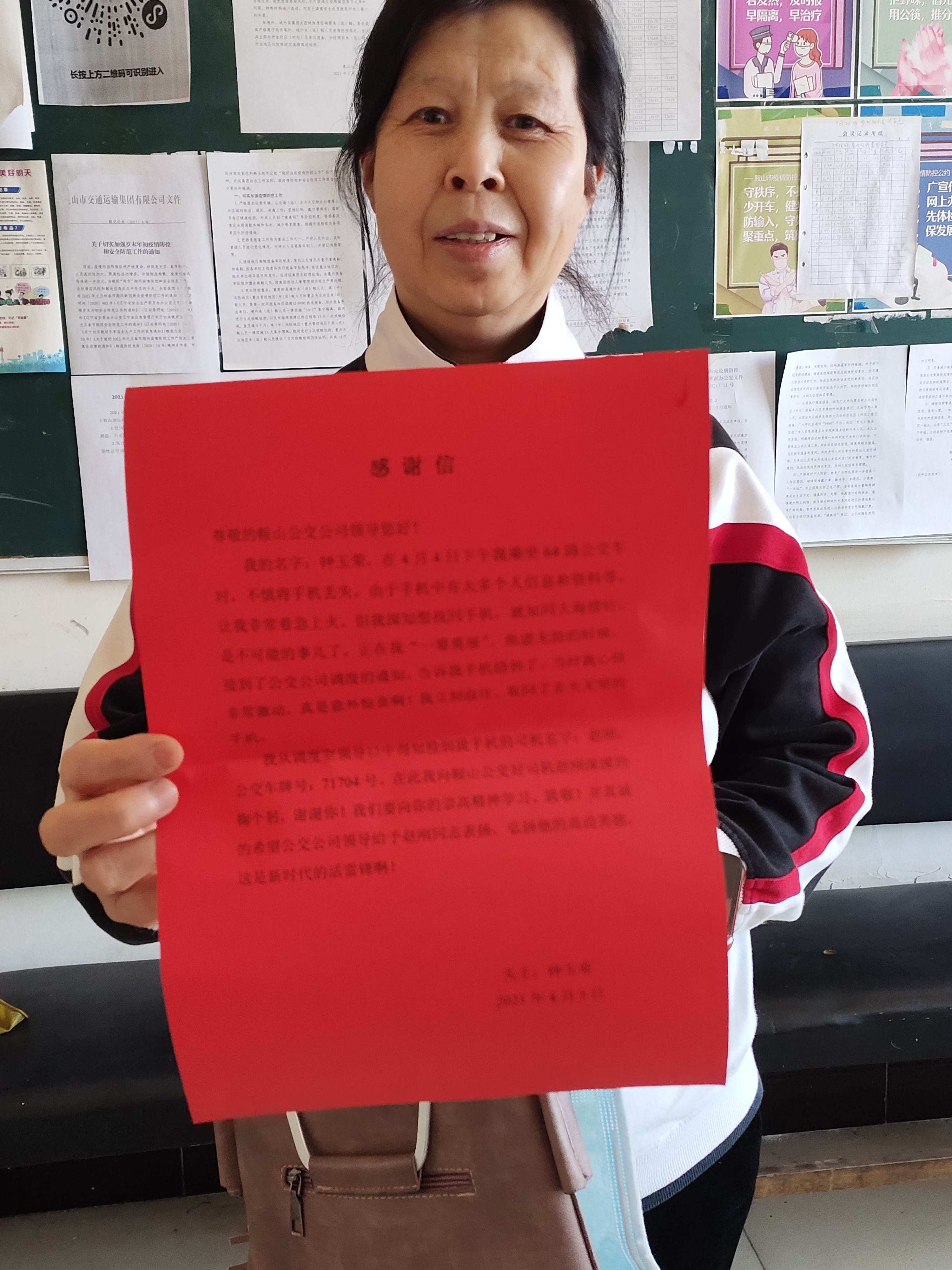 “如果手機(jī)丟失了會(huì)很麻煩,幸好碰到你這樣好司機(jī)……”市民鐘女士對(duì)交運(yùn)集團(tuán)第三汽車分公司客運(yùn)七隊(duì)拾金不昧的優(yōu)秀駕駛員趙剛再三表示感謝。