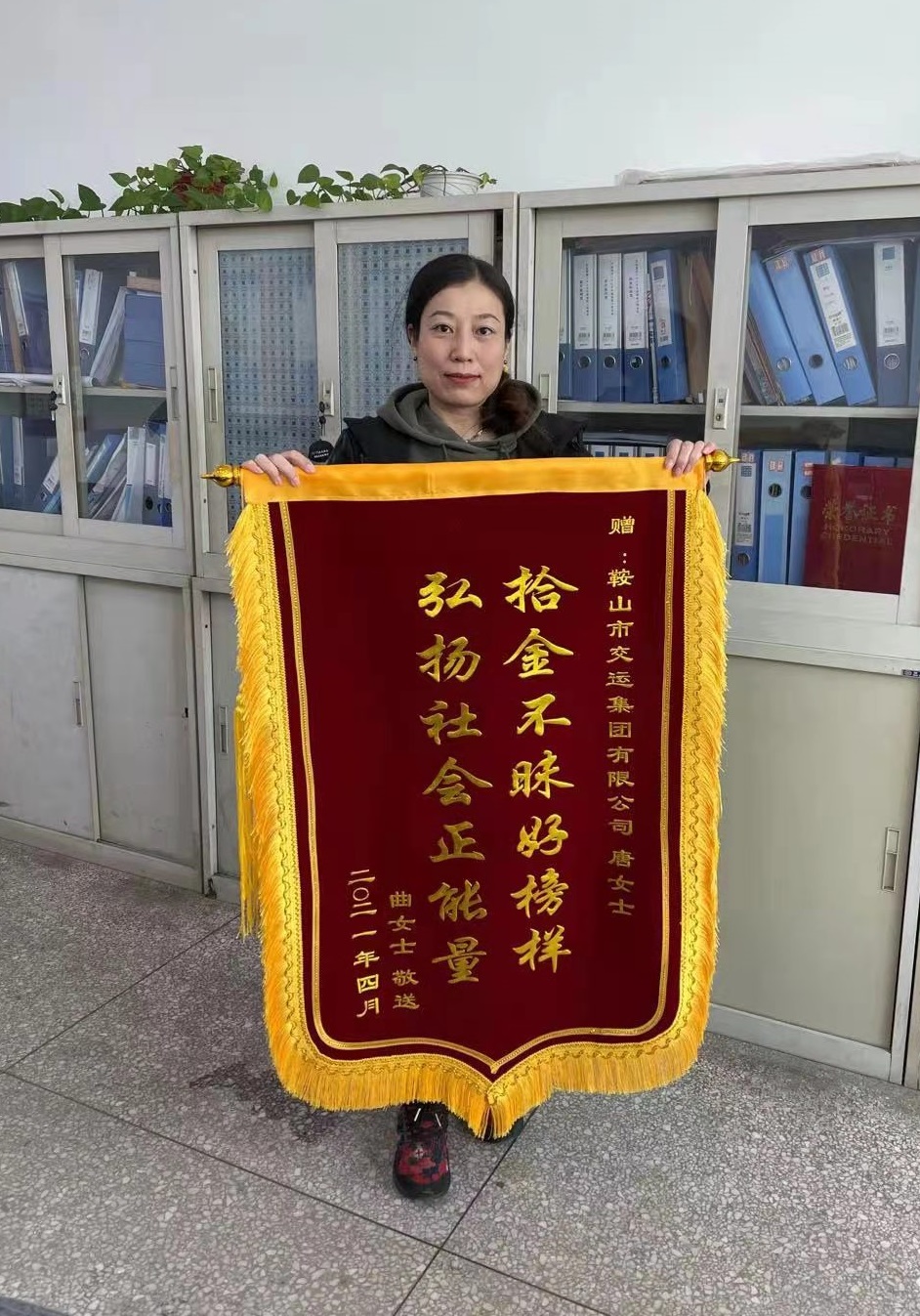 4月15日上午,市民曲女士帶刻有“拾金不昧好榜樣,弘揚(yáng)社會(huì)正能量”的錦旗,送到市交運(yùn)集團(tuán),感謝集團(tuán)員工“唐女士”第一時(shí)間里將拾到的價(jià)值萬(wàn)余元的蘋(píng)果12手機(jī)交還給她。